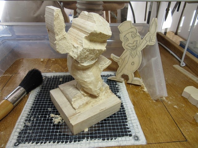 So, how do I mate Jiminy with dark chocolate? Answering that question was the fun part of this carving. Those of you who have a creative hobby understand all the thought that goes into creating a specific piece for a specific person. When all your thoughts and ideas reach that focal point you begin to "put it on paper" so too speak. In Jiminy's case, he'll be standing on and "melting" into a Ghirardelli dark chocolate square.