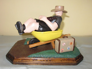 She is held to the base by two screws and glue. The boots, brick garden trim and bush are glued and inlaid.